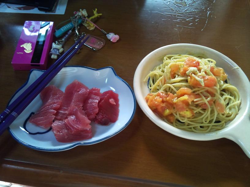 急きょパスタと、マグロの刺身というよくわからない組合せの夕飯になりました。