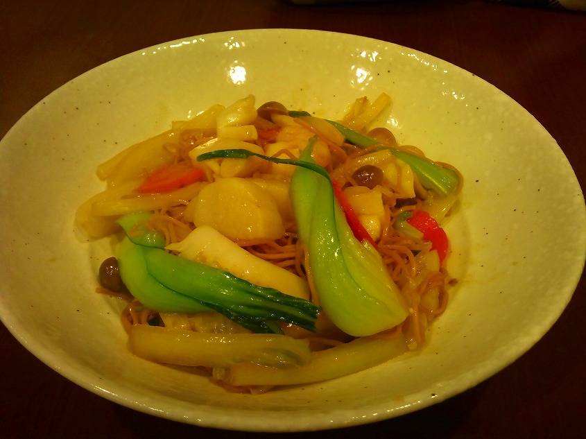 こちらの麺は少し変わっていて、皿うどんの麺を少し太くしたような感じのものでした。