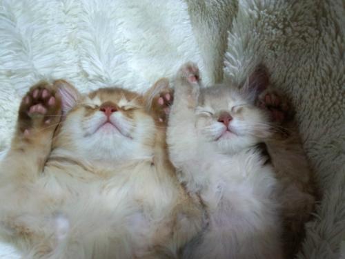 家の子猫ーズ達が寝ているときにオカンが万歳させました。