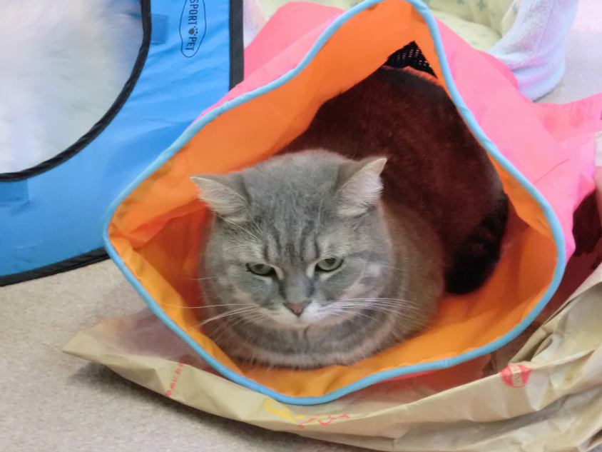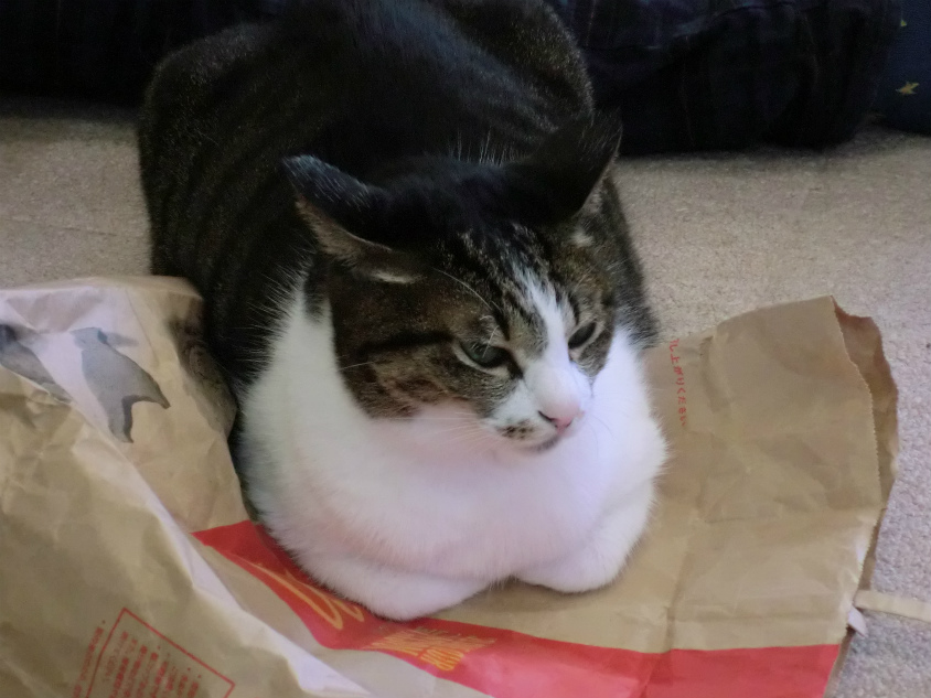 これはなぜか他の猫が袋で遊ぶのを妨害しているところです。