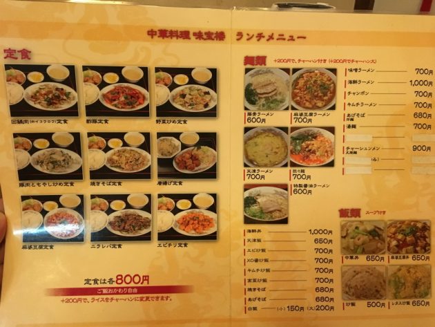 ランチメニューは大まかに3つのジャンルが有って、定食、麺類、飯類から選べます。定食と麺類は+200円でライスをチャーハンにチェンジ出来るようになってます。
