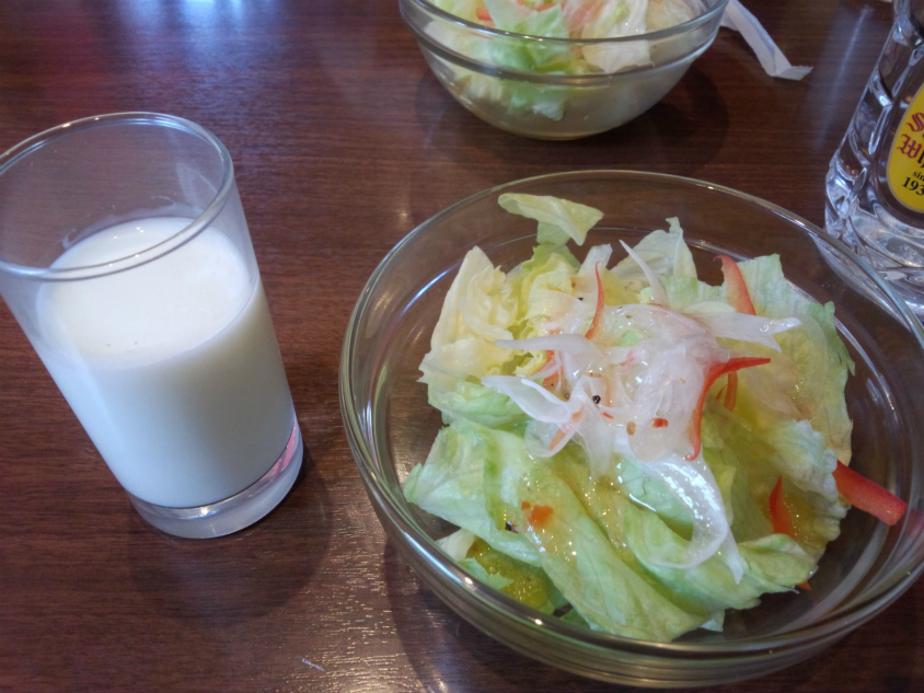 最初に出てきたのはセットメニューのサラダと飲むヨーグルトです。