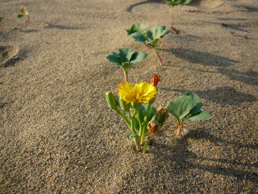 おくまで歩くと窪地のようになっている場所で水が溜まっていたり、花が咲いていたりしてちょっとした砂漠のオアシス気分を味わうことができます。家のワンコはそこの水たまりに入って遊んでました。