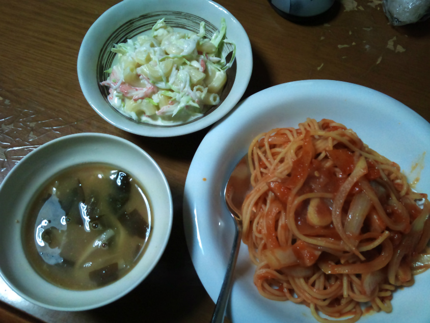 パスタとサラダ、ここまでは良い。普通だ。しかし最後の一品は味噌汁!