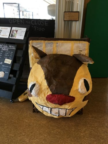 店舗の入口にはトトロのネコバスみたいな感じの手作り物体がありました。