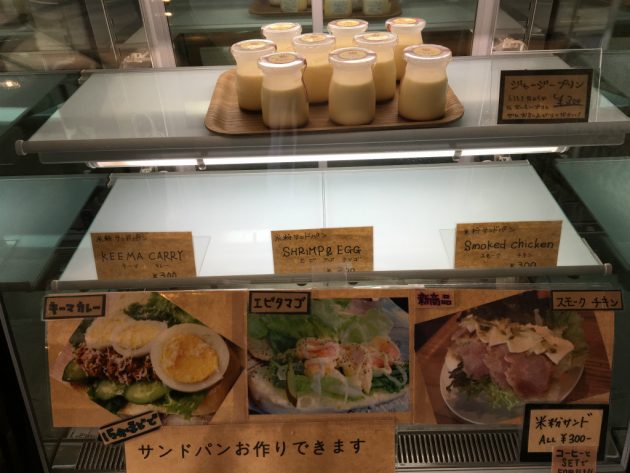 店内に入ったらまずはプリンとかのショーケースがあります。たぶんもうちょっと時間がたてばここにパンも並ぶんやと思います。