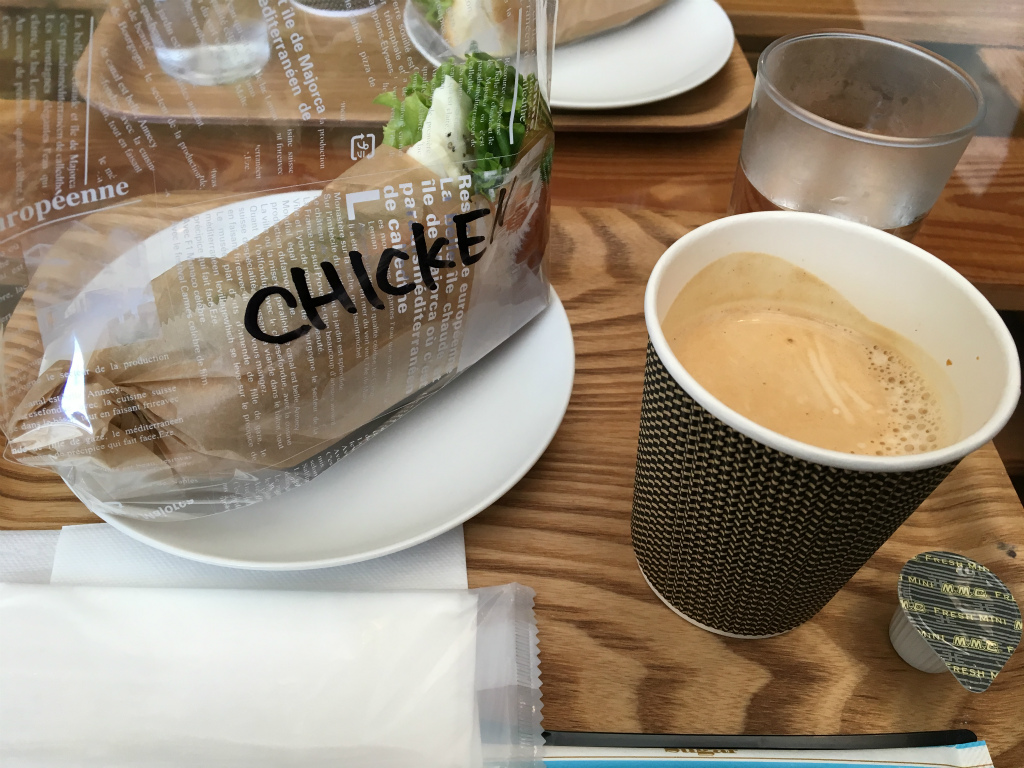 注文はスモークチキンサンドとホットコーヒーにしました。開店直後やからか15分ほどかかるって言われましたが、暇人で時間はいくらでもあったのでもちろん待ちます。