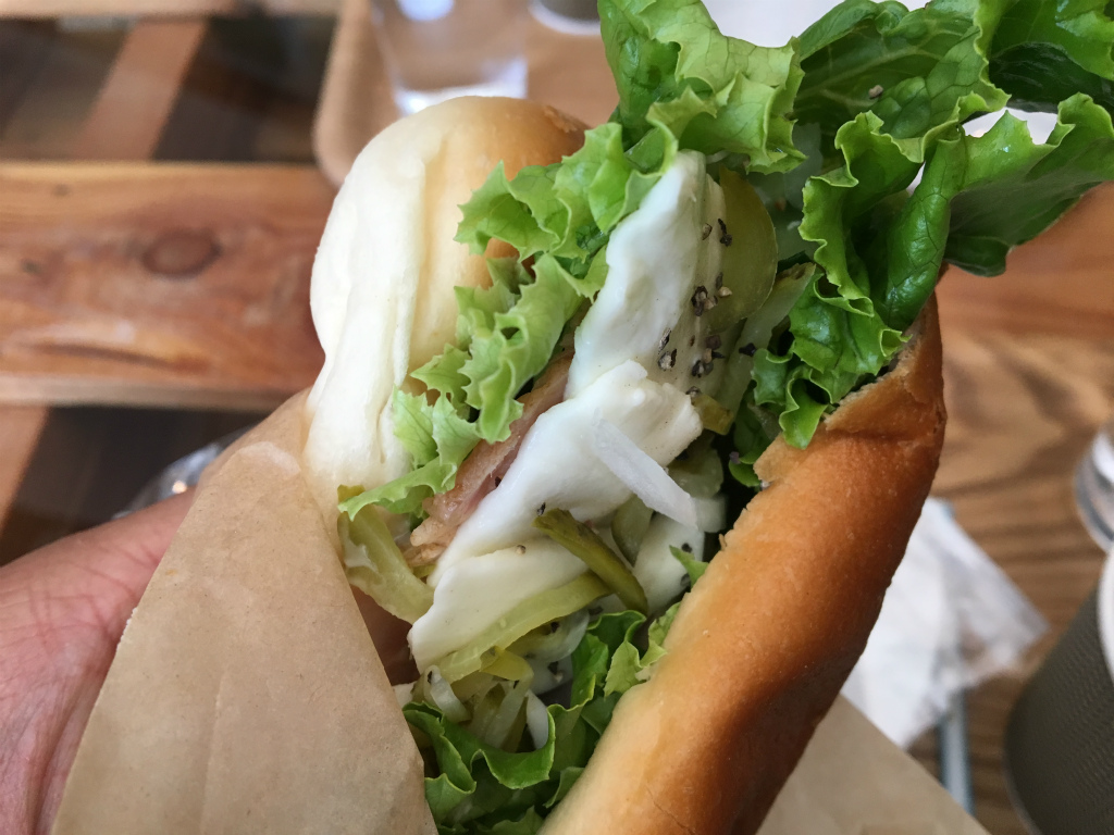 ただ食べてみたらパンは程よく塩味が効いてるのに、甘みもあって旨いってのとレタスもみずみずしくてめっちゃ旨いんですよ。