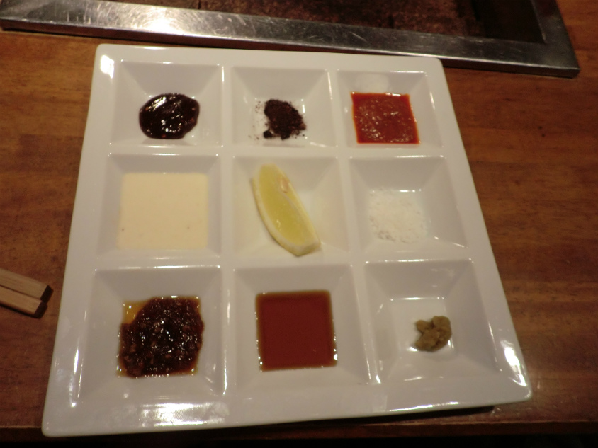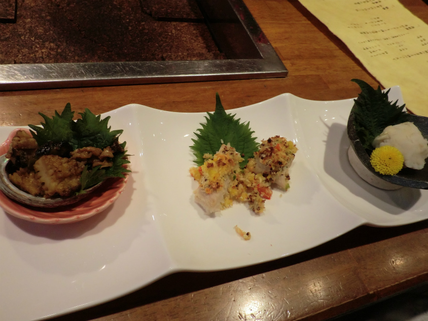 前菜が登場。ユリ根、ハチノス、アワビです。