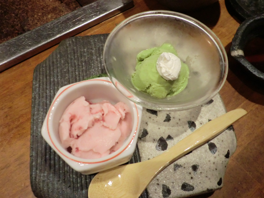 アイスクリームは抹茶とイチゴです。抹茶を食べてからイチゴを食べると