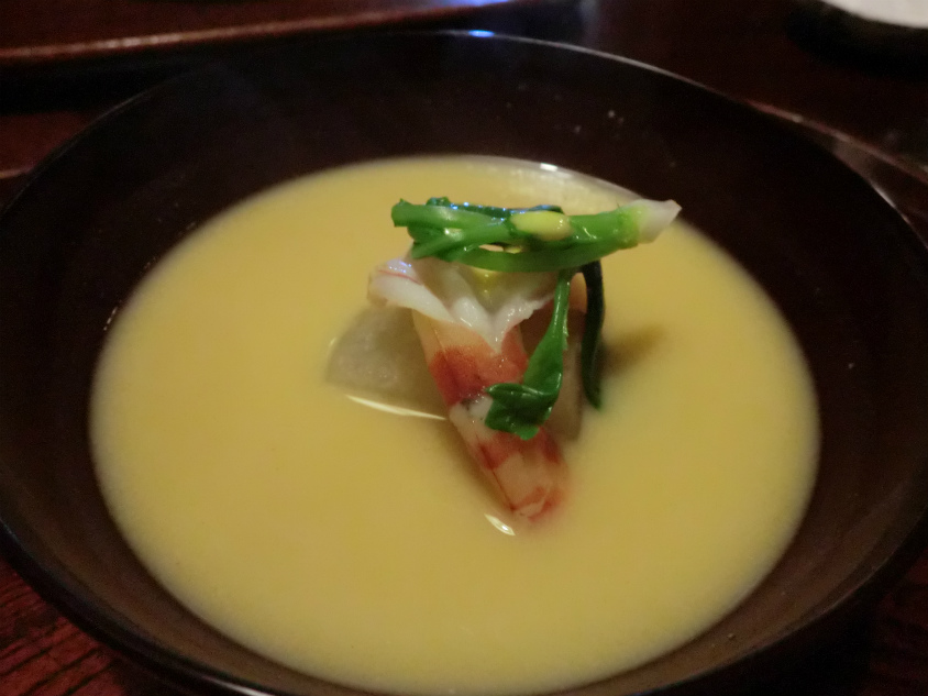 汁物はクルマエビと白みそのスープです。あれ?味噌汁かな?