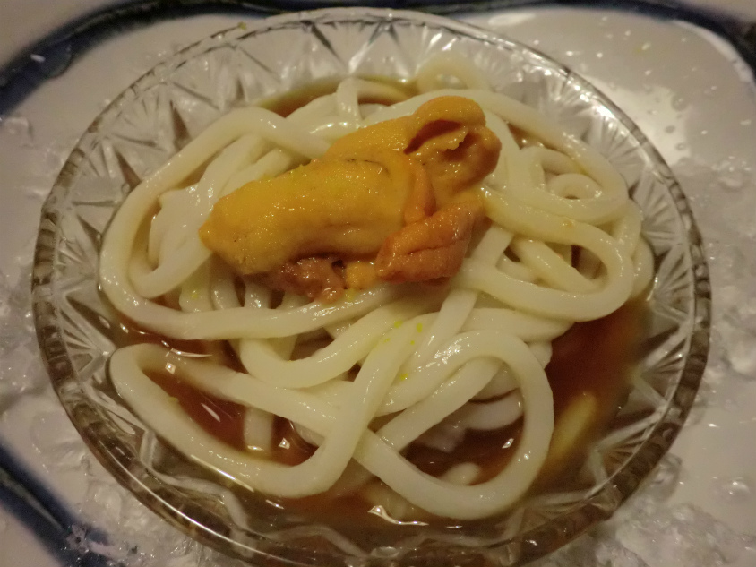 中身の正体は自家製のうどんでした。上にどでんとウニが載ってます。
