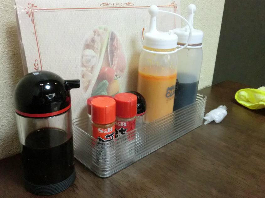 注文を済ませて卓上の写真をパチリ。ドレッシングに調味料など一般的なものです。