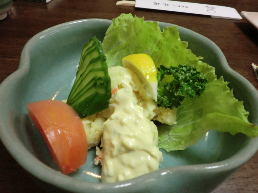 最初に出てきたのはポテトサラダです。量はほどほどで良かったです。