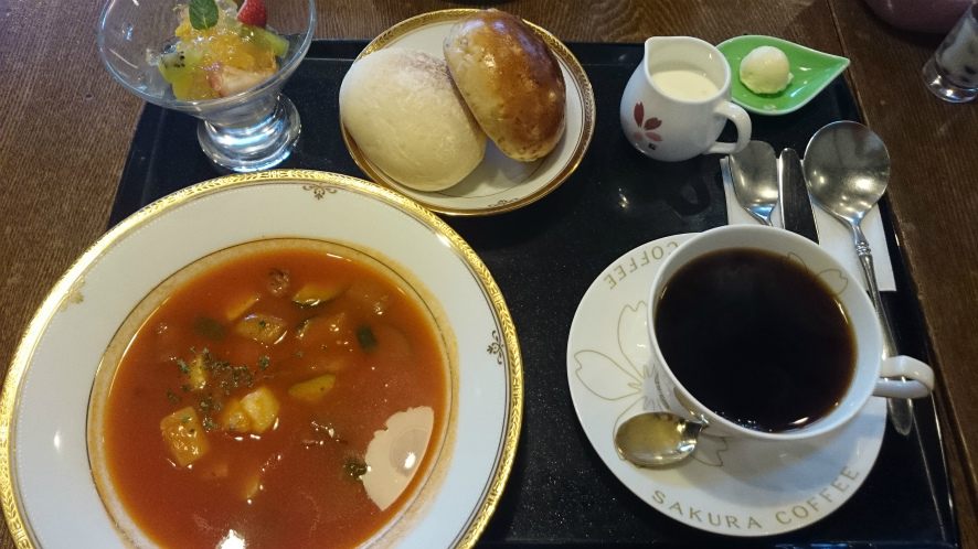 モーニングのセット内容はスープ、パン2つ、フルーツ、コーヒーです。