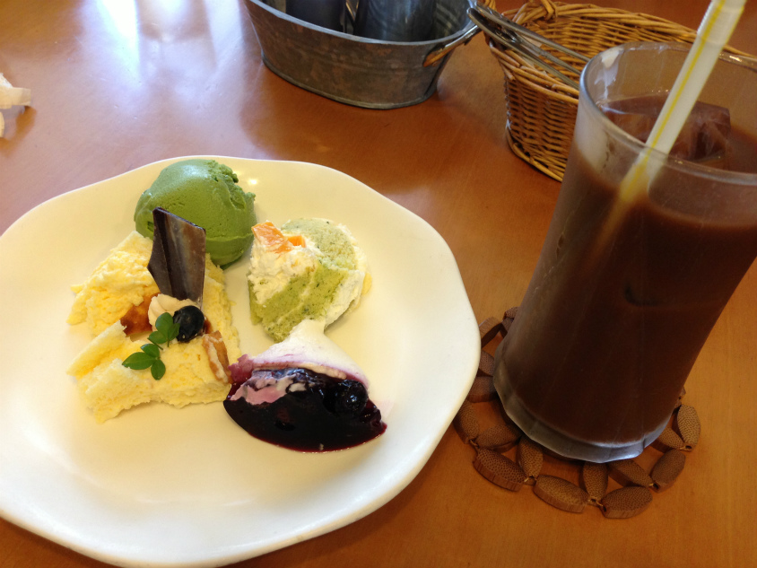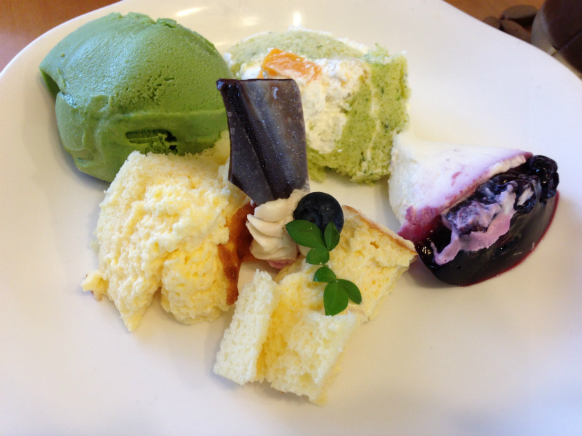 デザートはケーキとアイスクリームが数種類盛り合わせてある物。