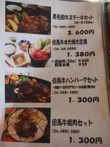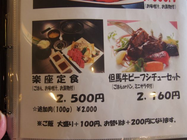 他のメニューは黒毛和牛と但馬牛の料理がいろいろです。今回は黒毛和牛ステーキセット(3600円)と楽座定食(2500円)を注文しました。