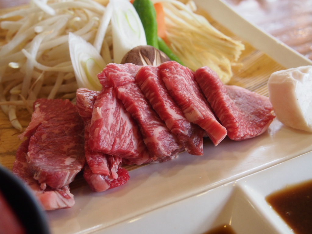 お肉はこんな感じでどちらかと言うと赤身寄りの肉かなって感じがします。食べてみたら結構柔らかくて美味しいですけど値段相応かって聞かれるとちょっとだけ値段負けしてる感じはします。