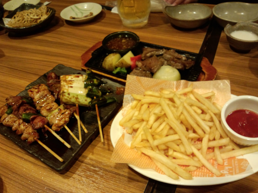 そしてこちらは誰かが頼んだポテトと焼き鳥とステーキです。