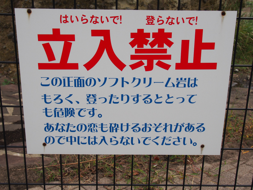 フェンスで保護されていますけど崩れやすいソフトクリーム岩と言う物があります。立入禁止の看板の文章がユーモアを凝らした感じになってますが、逆にスベってるような気もします。