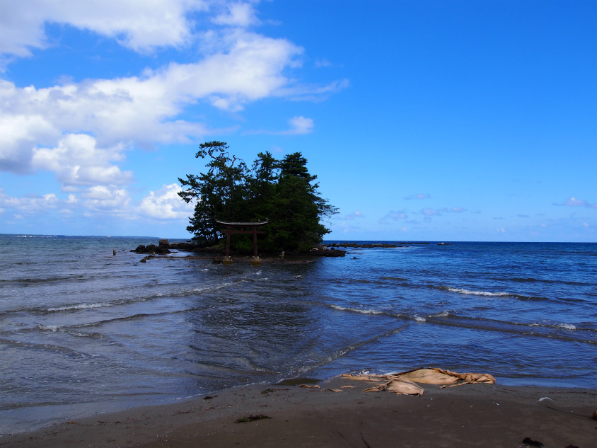 海岸からそれほど離れてない場所に小さな島(弁天島)と鳥居があります。この写真でも鳥居に向かう途中に地面が少し見えていますが、干潮の時なら歩いて渡ることが出来るようになります。
