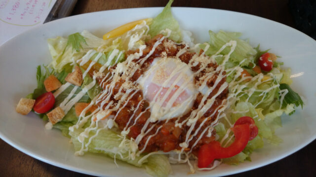 カレーはちょっとあっさり目、何味か分からんけど旨いドレッシング