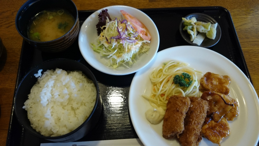 この日あったメニューはAセットが魚フライとグリルチキン、Bセットがラーメンとピラフ。