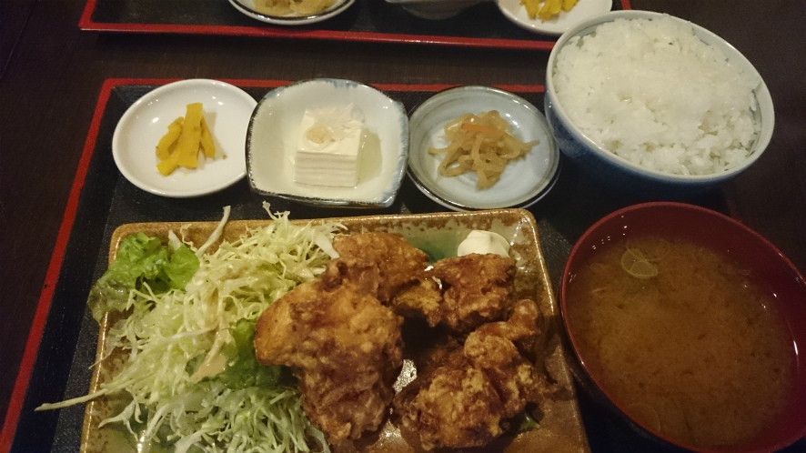 メインの唐揚げが5つくらいに味噌汁、ご飯、冷奴、切り干し大根、つけものがセット内容です。