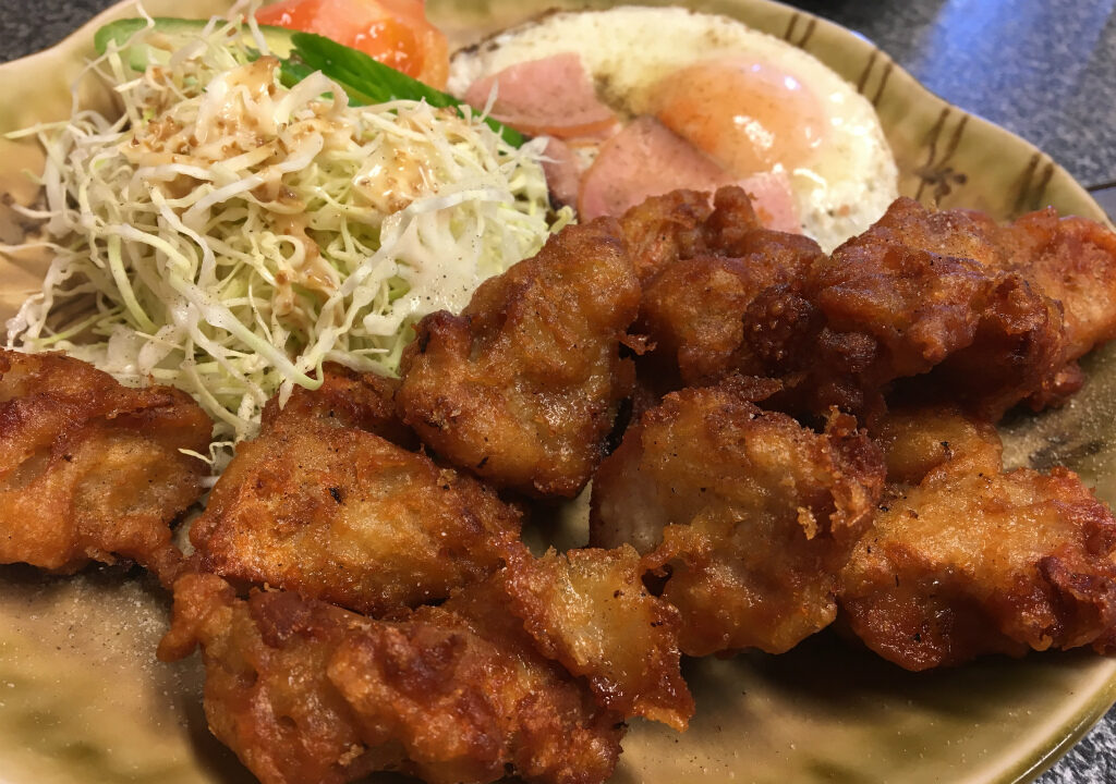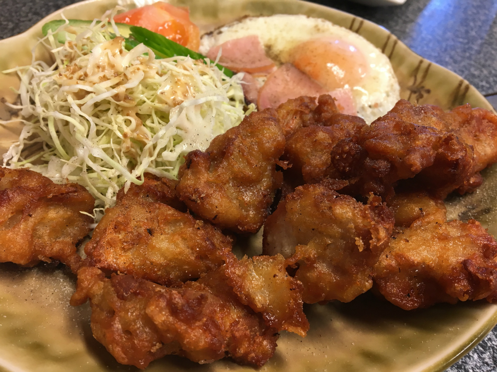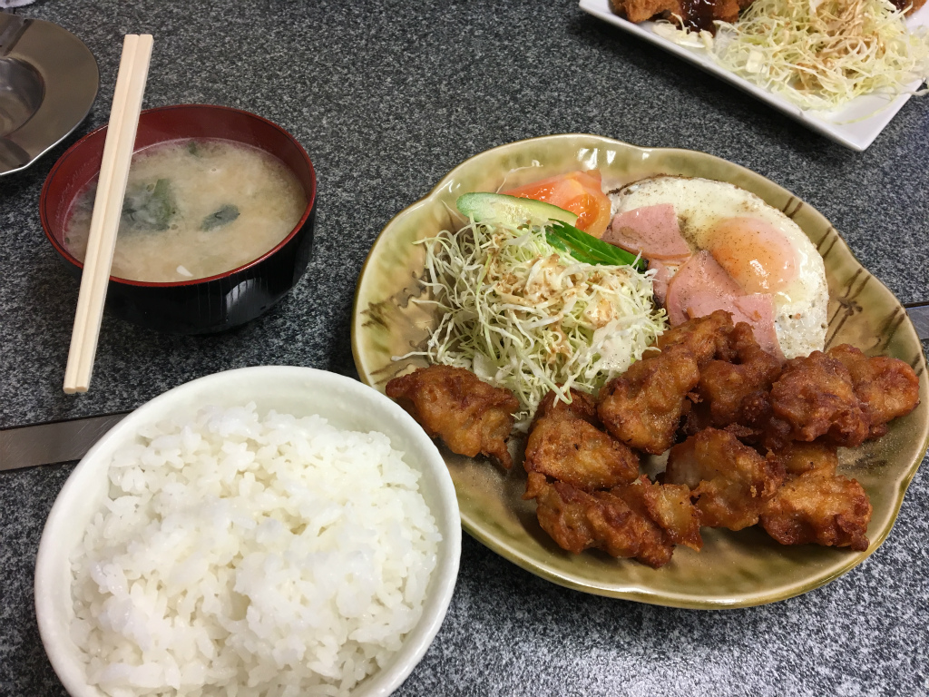 少し待って唐揚げ定食が堂々と登場しました。ご飯と味噌汁、唐揚げ8個ぐらい、ハムエッグ、サラダって言う中々ボリューム満点な内容になってます。