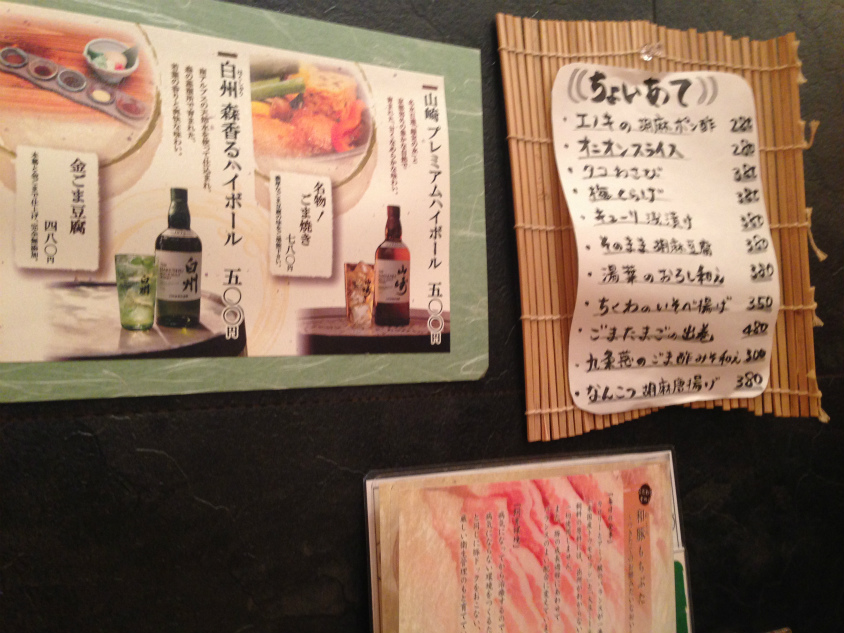 注文を済ませてテーブルの横の壁を見るとお酒やアテのメニューがありました。