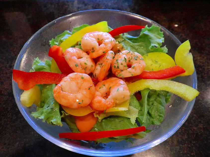 最初にサラダが出てきました。このお店はパスタでもそうですがエビメニューがいっぱいあります。