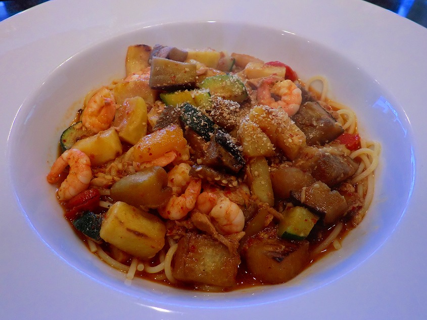 今回は地中海野菜のピリ辛スープスパとエビサラダにしました。