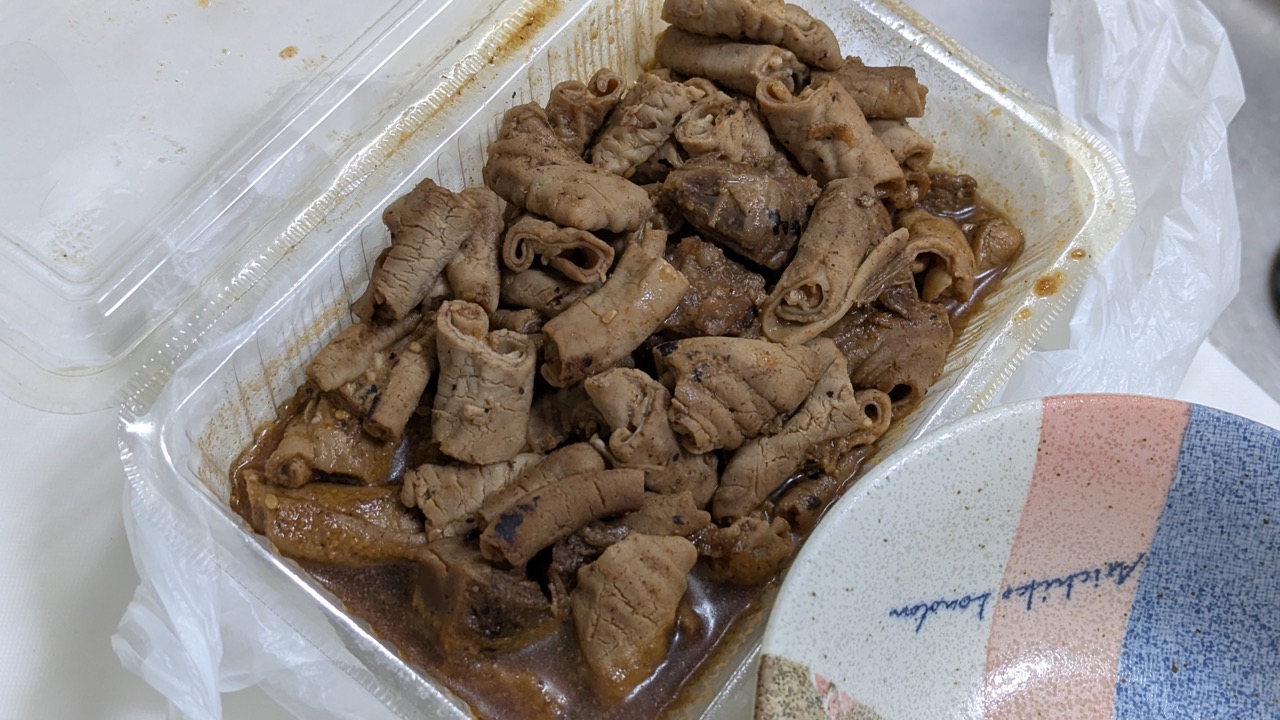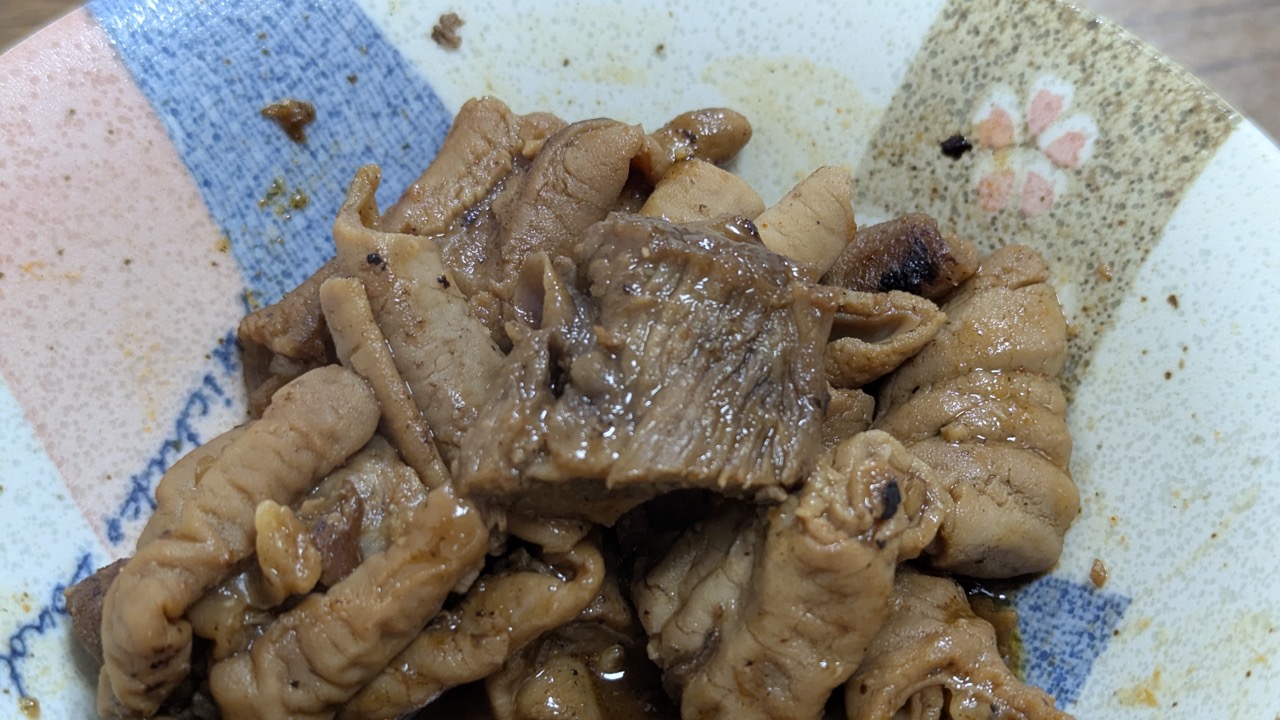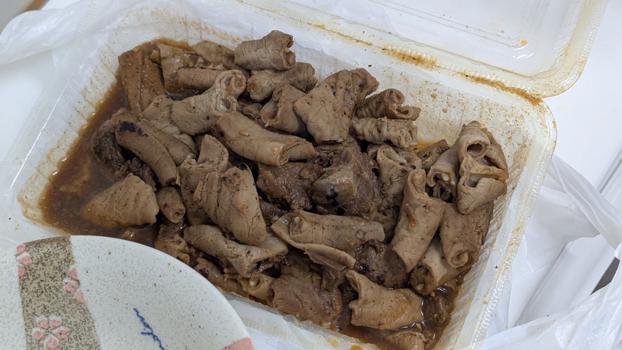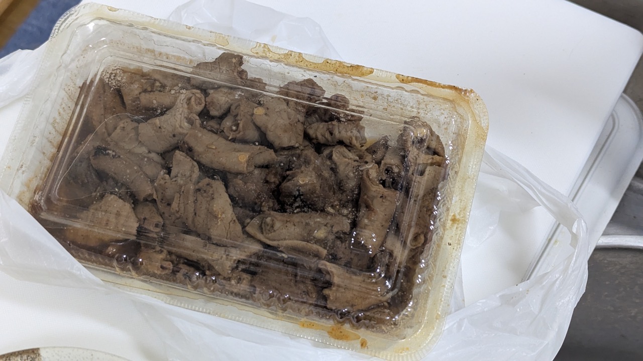 家に持ち帰って開封。タレの色がしっかり濃くて、いかにも甘辛系のホルモン焼きという感じです。