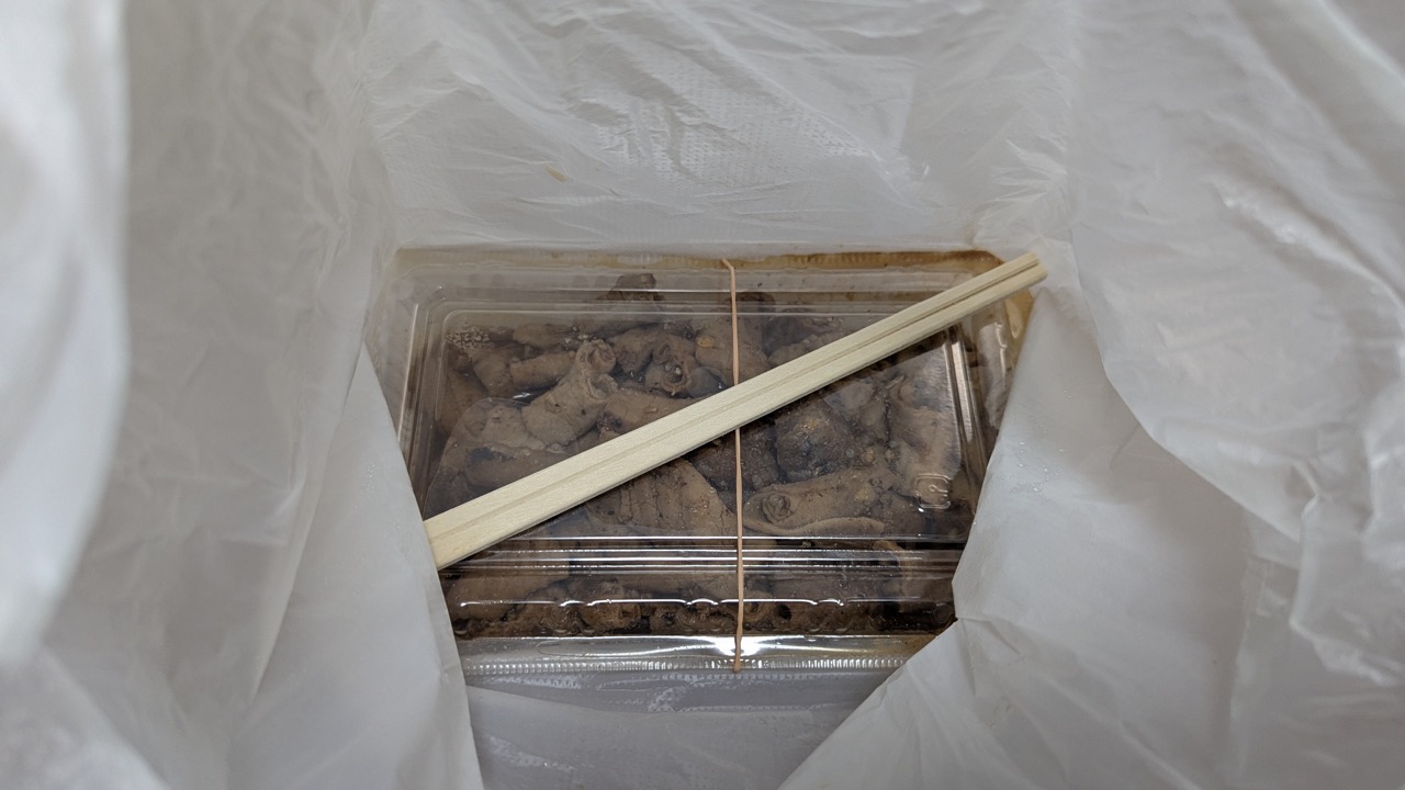 受け取ったホルモン焼き。タレがたっぷりかかってて、これだけで匂いが食欲を刺激してきます。