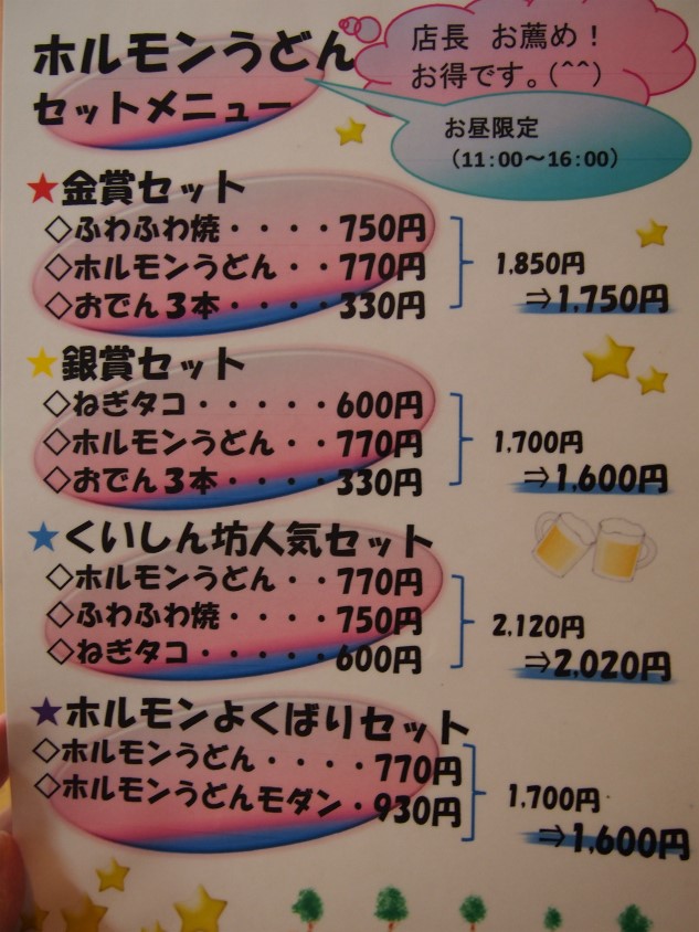ホルモンうどんセットメニューの金賞セットです。