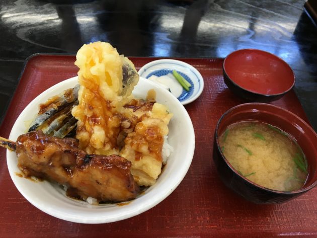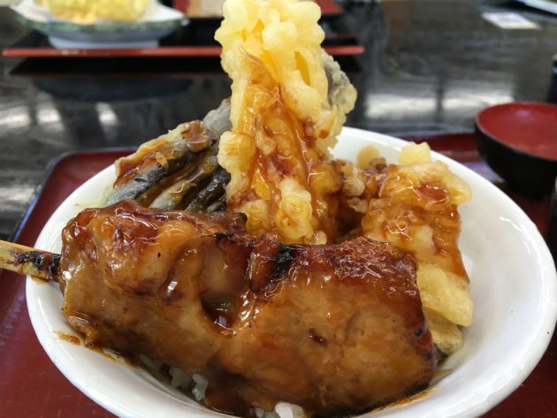 焼き鳥はちょっと大きめにカットしてあってよくある定番の照り焼きタレって感じです。天ぷらは茄子とかの夏野菜が入ってます。