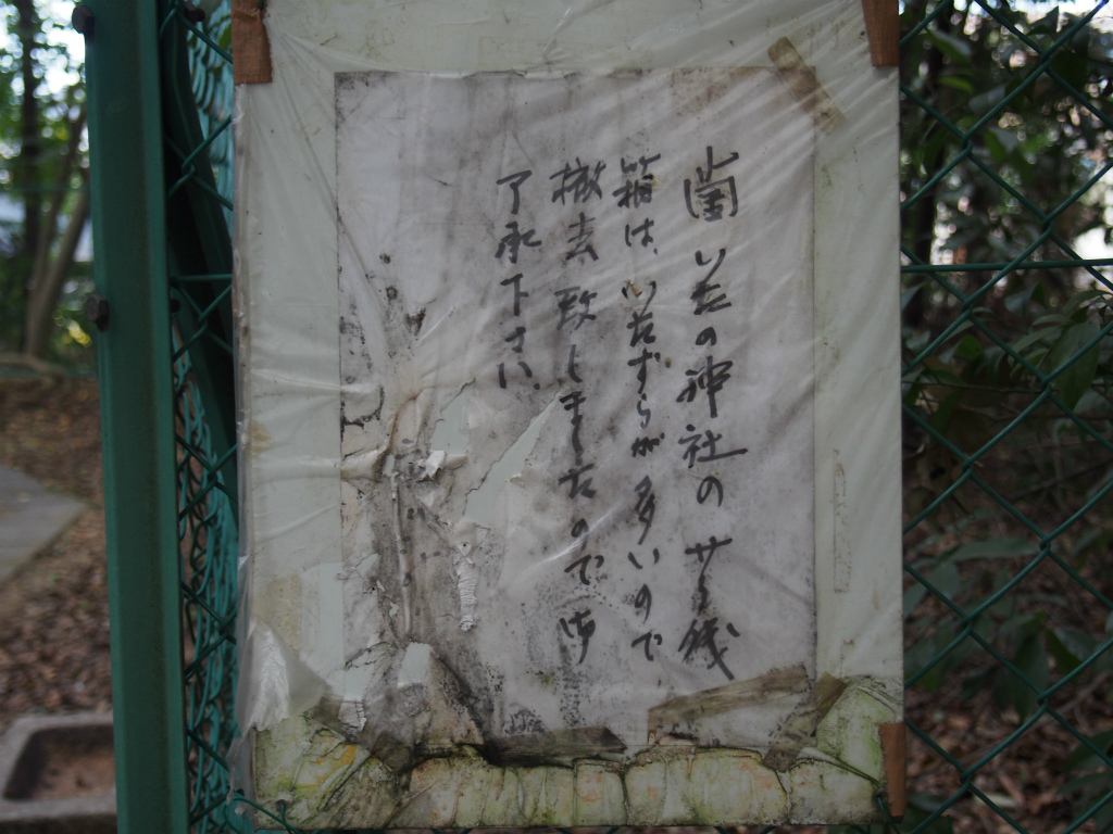 反対側のフェンスにはいたずらされるので賽銭箱撤去しましたって張り紙があります。奥まった場所だから賽銭泥棒とかがいたんでしょうね。