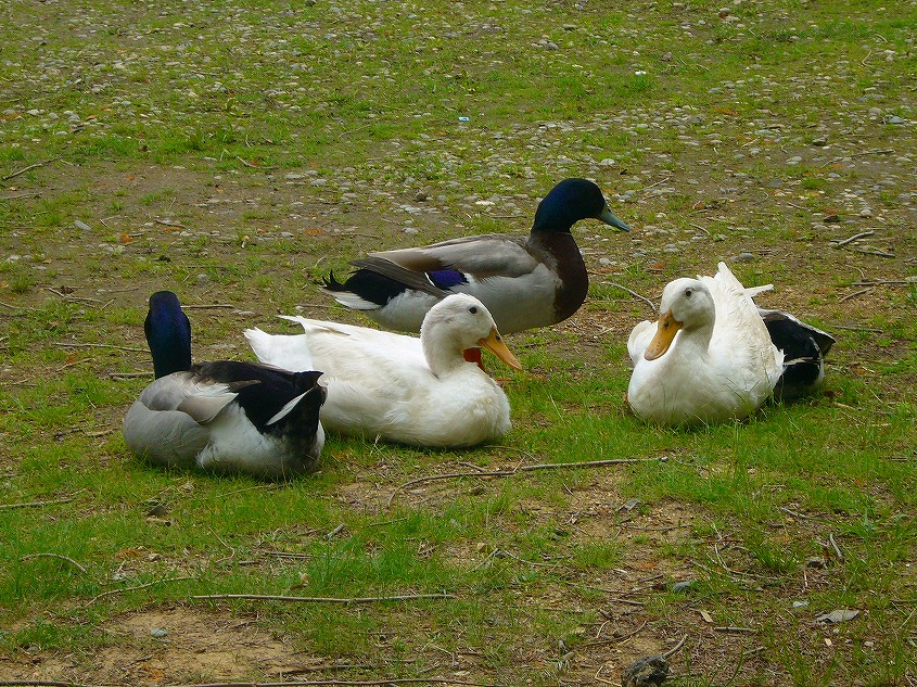 途中にある池のそばでくつろいでる?鴨とアヒルを発見。