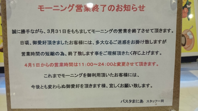 移転してからずっとやっていたモーニングがなくなってしまいました。営業時間をちょっと短縮するためだそうです。