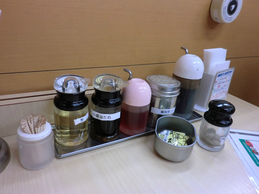 卓上にはいろんな調味料と小袋のにんにくが置いてあります。
