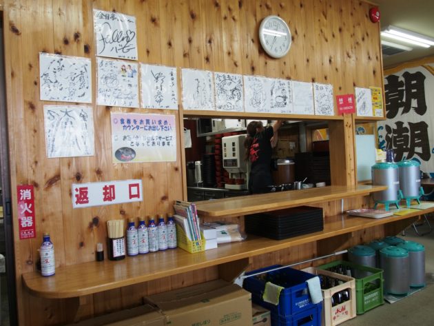 食べ終わった後は返却口にセルフで食器を返すシステムになってます。この壁の上の方に有名人のサインが一杯ありますね。