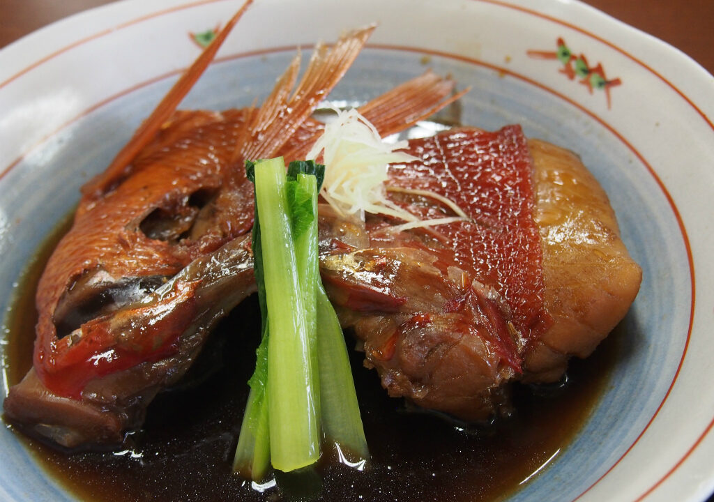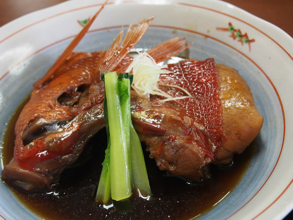 メインのキンメダイの煮付けはこんな風に思ってたよりもだいぶデカイです。しっかり味がついてるしカマの部分やけど身がめっちゃついててかなり嬉しいです。