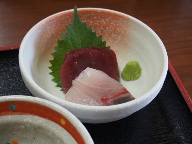 刺身はマグロとハマチ?やと思います。刺身好きなんでちょっとでもこうやって付けてくれるのはうれしいですね。