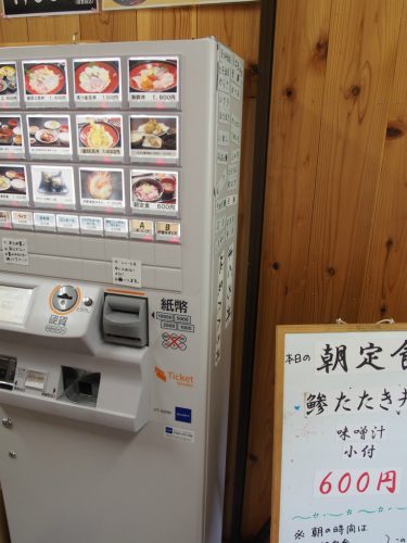 店に入ったらまずは食券を買うようになってます。食券機の横に日替わり定食のメニューも置いてあってこの日は鯵のタタキ丼でした。僕は金目煮付定食(1500円)を注文しました。