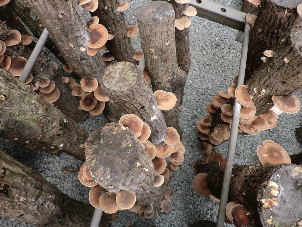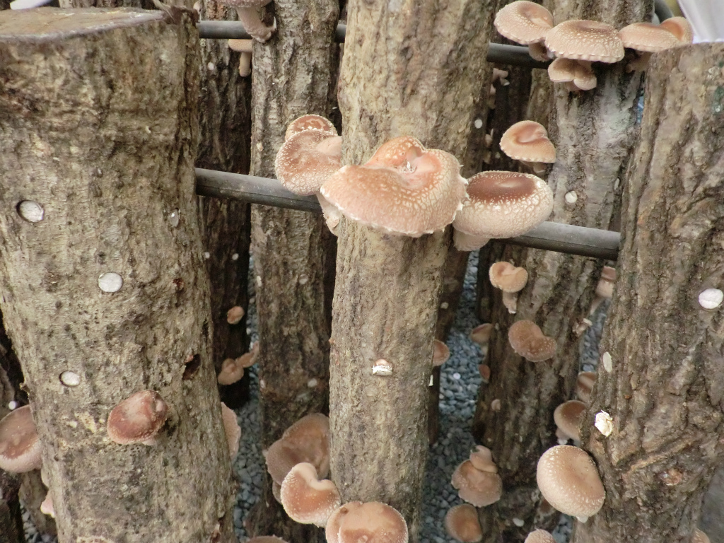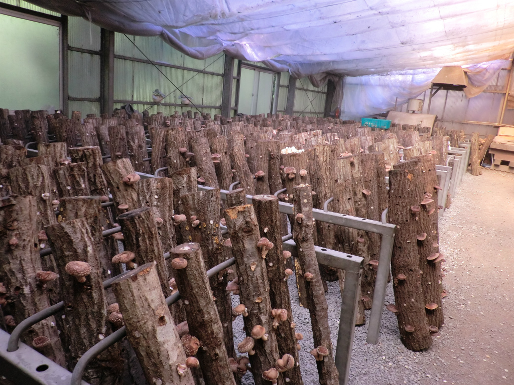 受付でお金を支払ったらそのまま奥へ入るとそこがしいたけの原木が置いてあるハウスです。