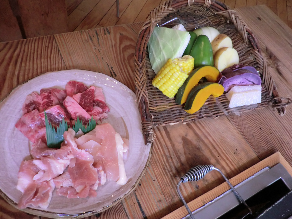 バーベキューセットを注文するとこんな感じでお肉と野菜、後はご飯が用意されます。