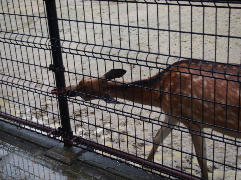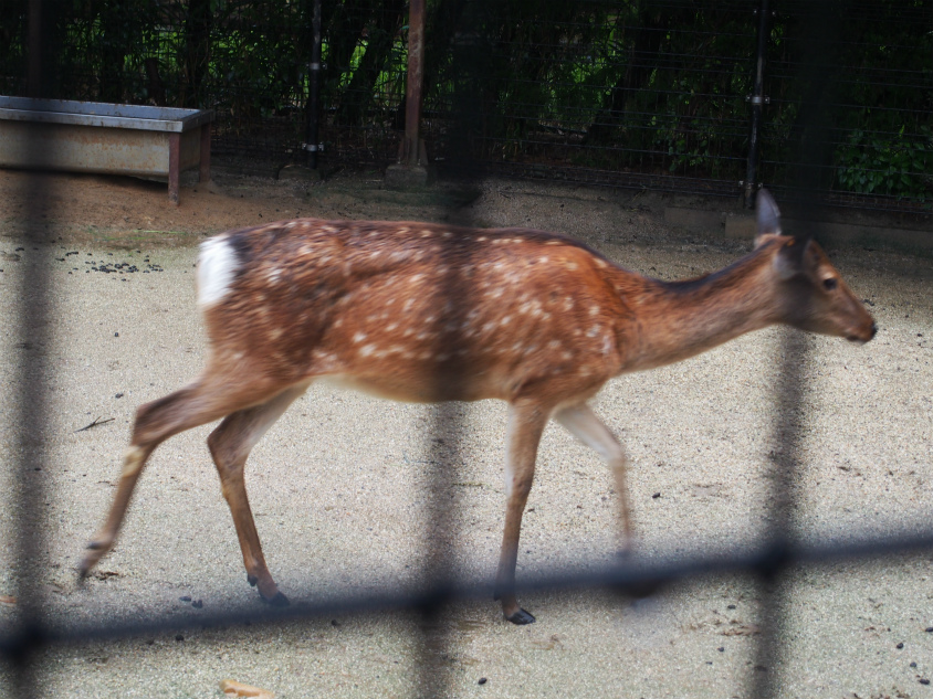 今回の最後の写真がニホンジカです。このシカがちょっと変わっていて柵のところまで歩いてきて頭をこちらに向けて歩いていくっていう謎だけどかわいい行動をとっていました。
