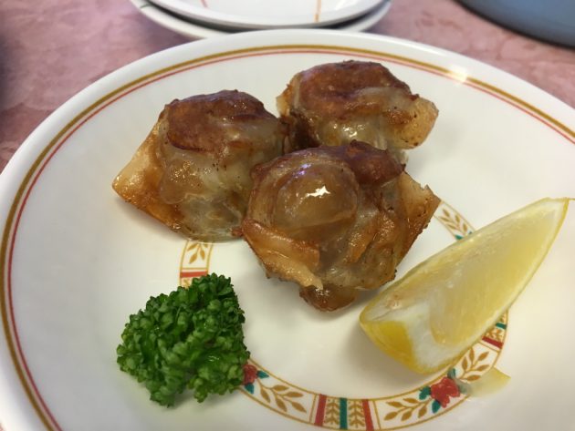 次に登場したのは揚げシュウマイ3個です。うん、まあ王道の揚げシュウマイって感じです、それ以上に表現しようが無い。