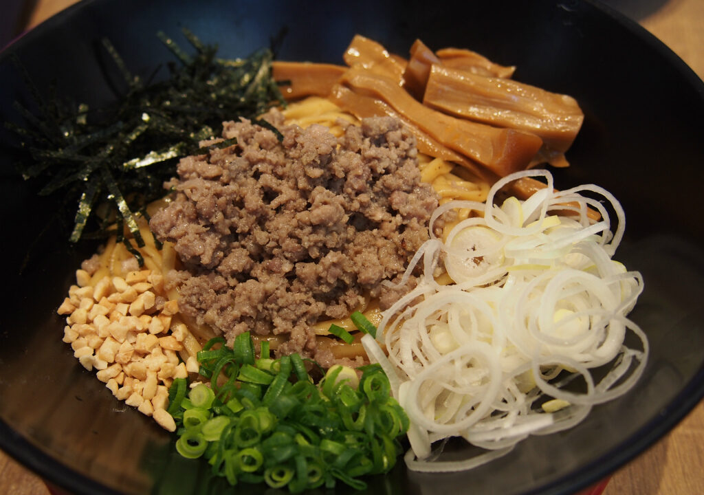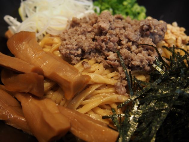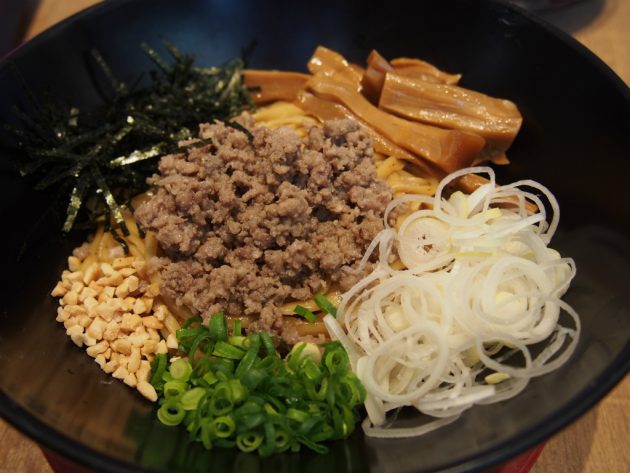 次にメインのまぜそばです。シンプルやけどちゃんと味がついてて美味しかったです。ひき肉がたっぷりはいってるのもいい感じでした。
