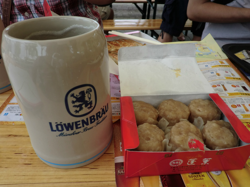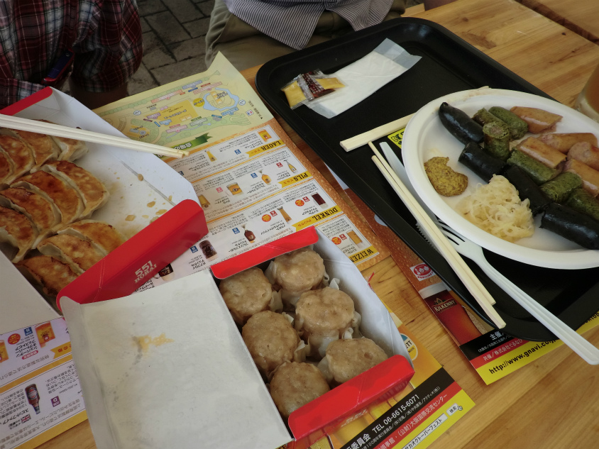 そしてつまみは551の餃子と肉焼売、会場のウィンナーです。